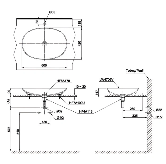 6. Bản vẽ kỹ thuật 2D lavabo Đặt Bàn LT4706