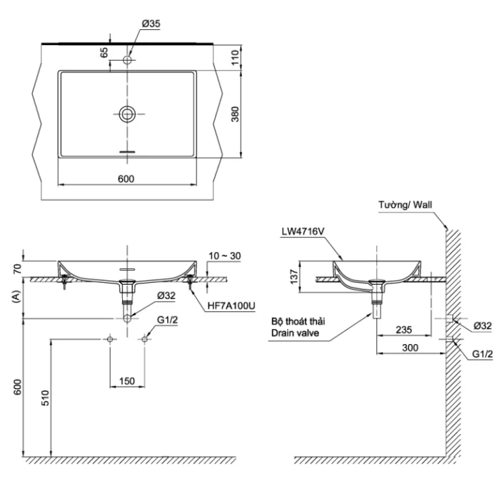 Với kích thước 380 × 600 × 137 mm, sản phẩm có độ cân đối, dễ dàng kết hợp với bàn đá granite, marble hoặc đá nhân tạo, giúp không gian thêm gọn gàng và tinh tế.