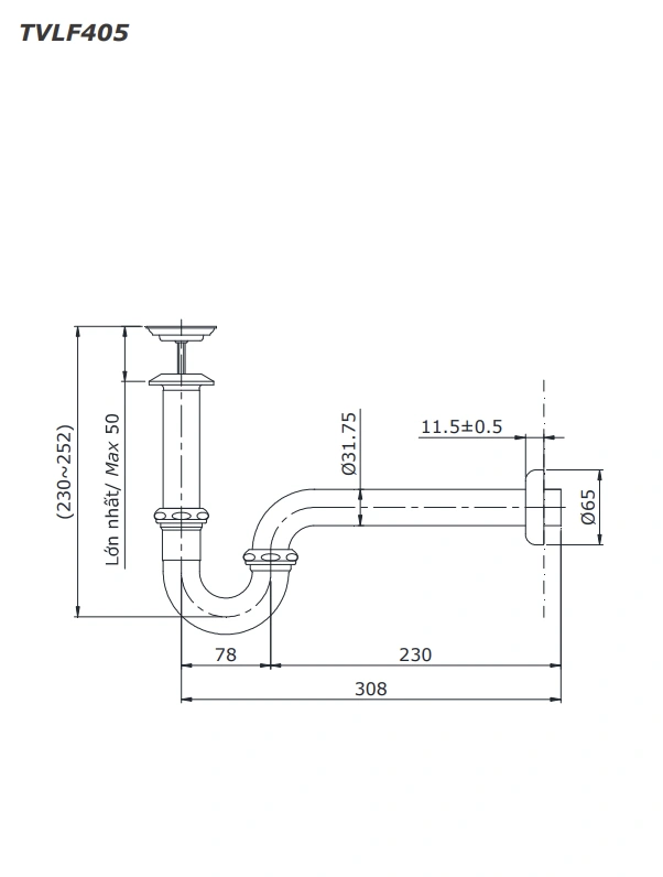 P‑Trap TVLF405 có bộ hình chữ P truyền thống, giúp giữ nước để tạo hàng rào ngăn mùi từ hệ thống cống. Kích thước chiều dài tiêu chuẩn 308 mm phù hợp với nhiều cấu hình lắp đặt hiện nay.