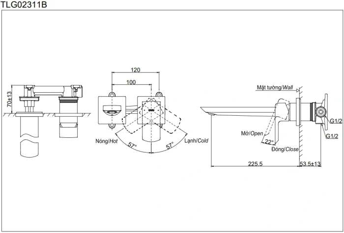 Loại sản phẩm: Vòi lavabo nóng lạnh gắn tường