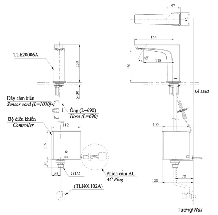 6. Bản vẽ kỹ thuật 2D vòi lavabo cảm ứng TLE20006A