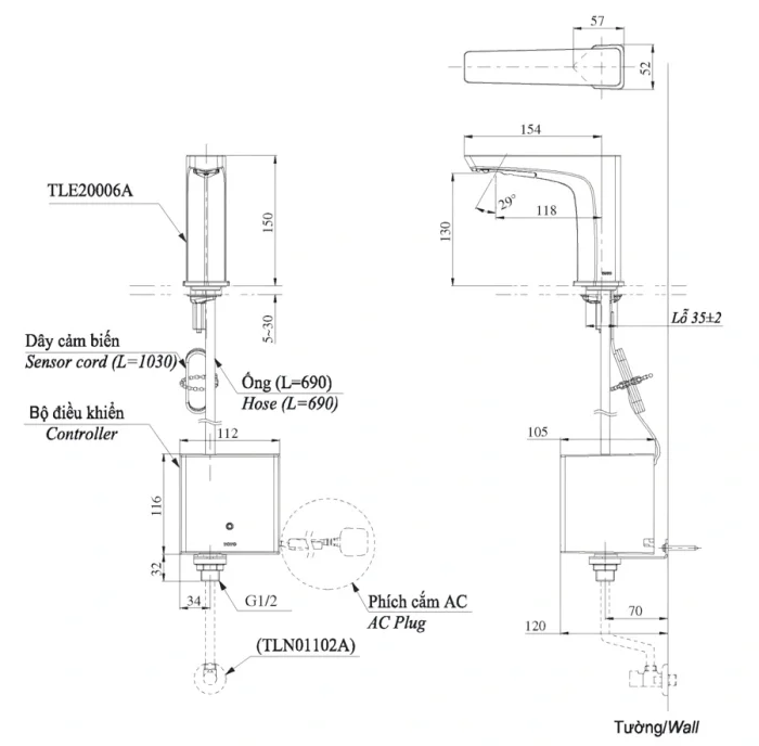 6. Bản vẽ kỹ thuật 2D vòi lavabo cảm ứng TLE21006A