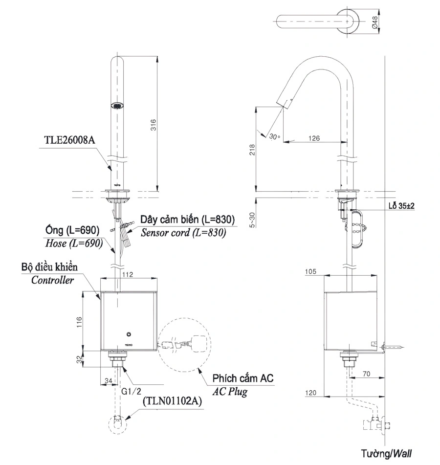6. Bản vẽ kỹ thuật 2D vòi lavabo cảm ứng TLE26008V