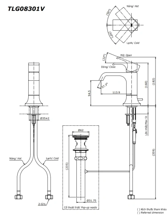 6. Bản vẽ kỹ thuật 2D vòi lavabo gật gù nóng lạnh TLG08301V
