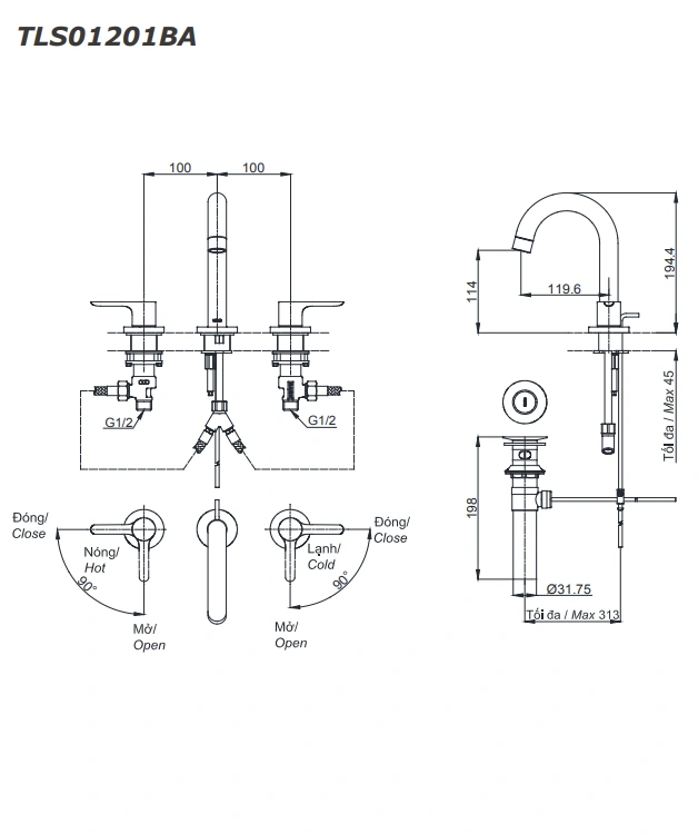 6. Bản vẽ kỹ thuật 2D vòi lavabo tay vặn nóng lạnh TLS01201BA