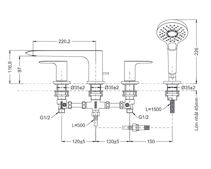 Kiểu lắp đặt: Gắn tường hoặc gắn trực tiếp bồn tắm.