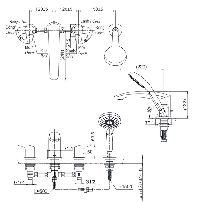Chất liệu: Đồng thau mạ crom hoặc inox 304 cao cấp.