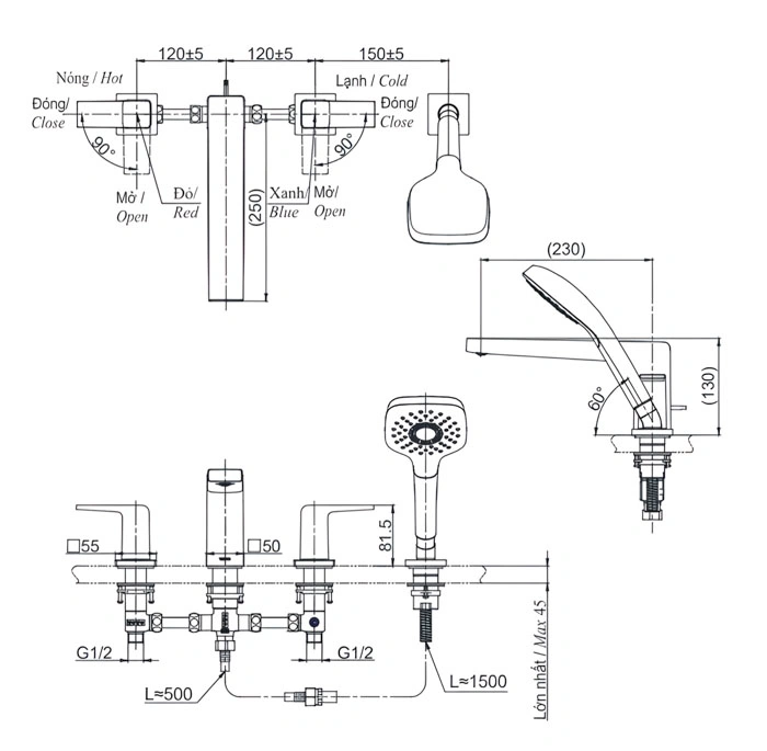 Kiểu lắp đặt: Gắn tường hoặc gắn trực tiếp bồn tắm.