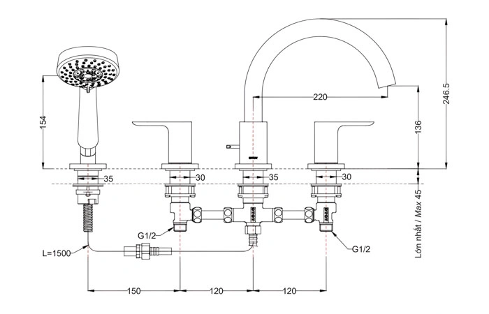 Kiểu lắp đặt: Gắn tường hoặc gắn trực tiếp bồn.